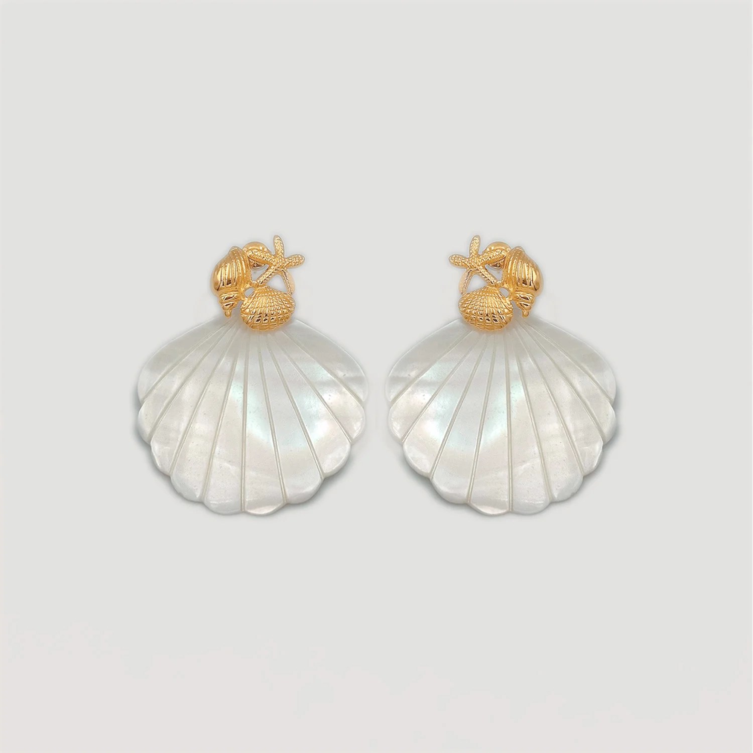 - Â Luminous Pearly White Shell Drops: Each earring features a sculptural shell drop with a soft pearly finish that catches the light gracefully, evoking the natural shimmer of seashells found along the shore. This adds an elegant and eye-catching dimension to the design.
